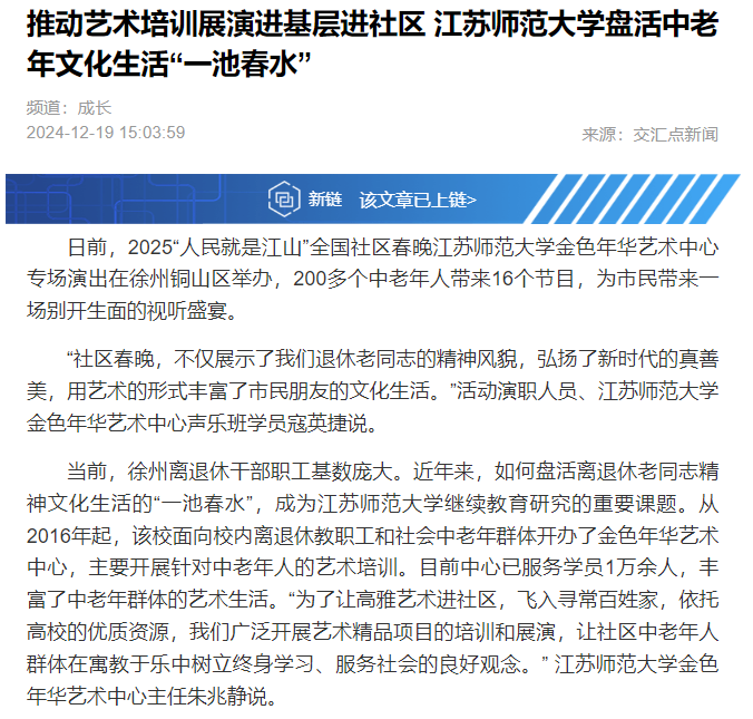 推動藝術(shù)培訓(xùn)展演進(jìn)基層進(jìn)社區(qū) 江蘇師范大學(xué)盤活中老年文化生活“一池春水”