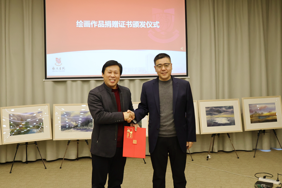 活動現場,美術學院甘興義教授滿懷對教育事業的深厚情懷與對校園文化建設的大力支持,無私捐贈出多幅精心創作的繪畫佳作,這些作品將在學生“一站式”社區陳列展示,不僅為社區空間注入了藝術活力,更為莘莘學子營造了濃郁的藝術氛圍,使他們能夠近距離感受繪畫藝術的獨特魅力,在潛移默化中提升審美素養。趙鵬代表學校向甘興義教授頒發捐贈證書,對他的善舉表示衷心感謝。