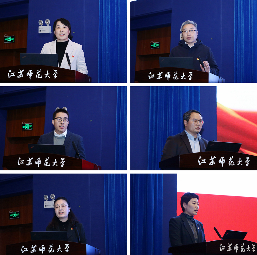 “2024年度黨委理論學習中心組示范點”獲獎代表、電氣工程及自動化學院黨委書記潘震鑫,“黨委理論學習中心組成員專題調查研究優秀調研報告”獲獎代表、物理與電子工程學院黨委書記王夫壽,“全省高校‘雙帶頭人’教師黨支部書記‘強國行’專項行動團隊”代表、化學與材料科學學院教工一支部支部書記姜波,“江蘇省課程思政典型案例(專業)”獲獎代表、語言科學與藝術學院副院長朱祖德,思政課教師代表匡艷麗,網絡思想政治工作代表、黨委宣傳部宗倩等6位同志,在大會上交流匯報了工作經驗與心得體會。