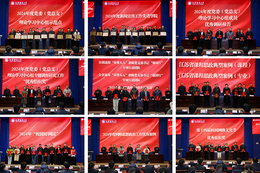 會議對2024年度黨委理論學習中心組示范點、新聞宣傳工作先進學院、黨委理論學習中心組成員優秀調研報告、黨委理論學習中心組專題調查研究工作“優秀組織獎”、“校園好網民”、網絡思想政治工作優秀案例、第十四屆校園網絡文化節優秀組織獎,以及全國全省高校“雙帶頭人”教師黨支部書記“強國行”專項行動團隊、全省高校“最佳黨日活動”、江蘇省課程思政典型案例等相關獲獎集體和個人進行了表彰。