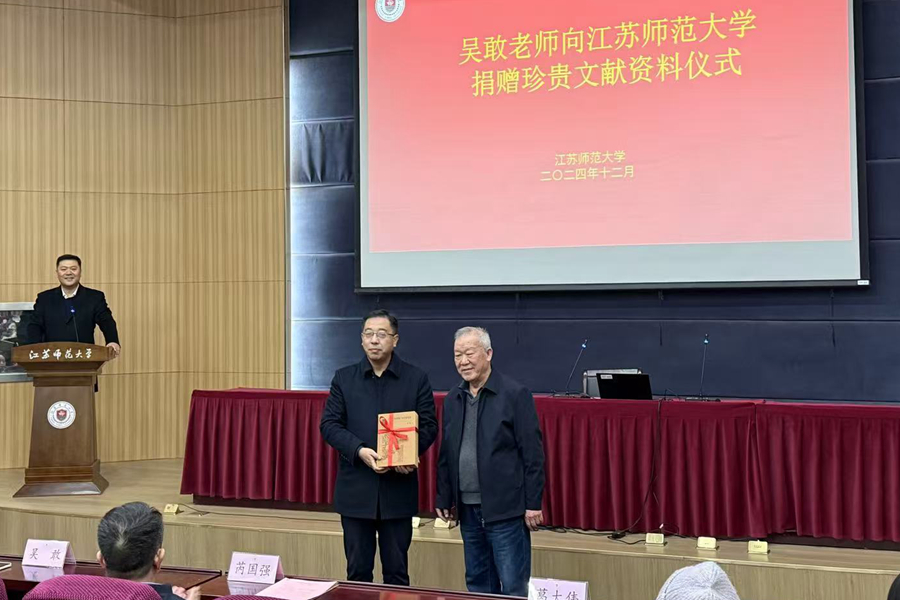 近日,我校在西教2號樓學術報告廳舉行珍貴校史資料捐贈儀式。我校杰出校友、徐州教育學院原黨委書記、院長吳敢及其夫人李芳榮向我校捐贈珍貴校史資料,校黨委書記芮國強出席活動,文學院師生代表100余人參加活動。