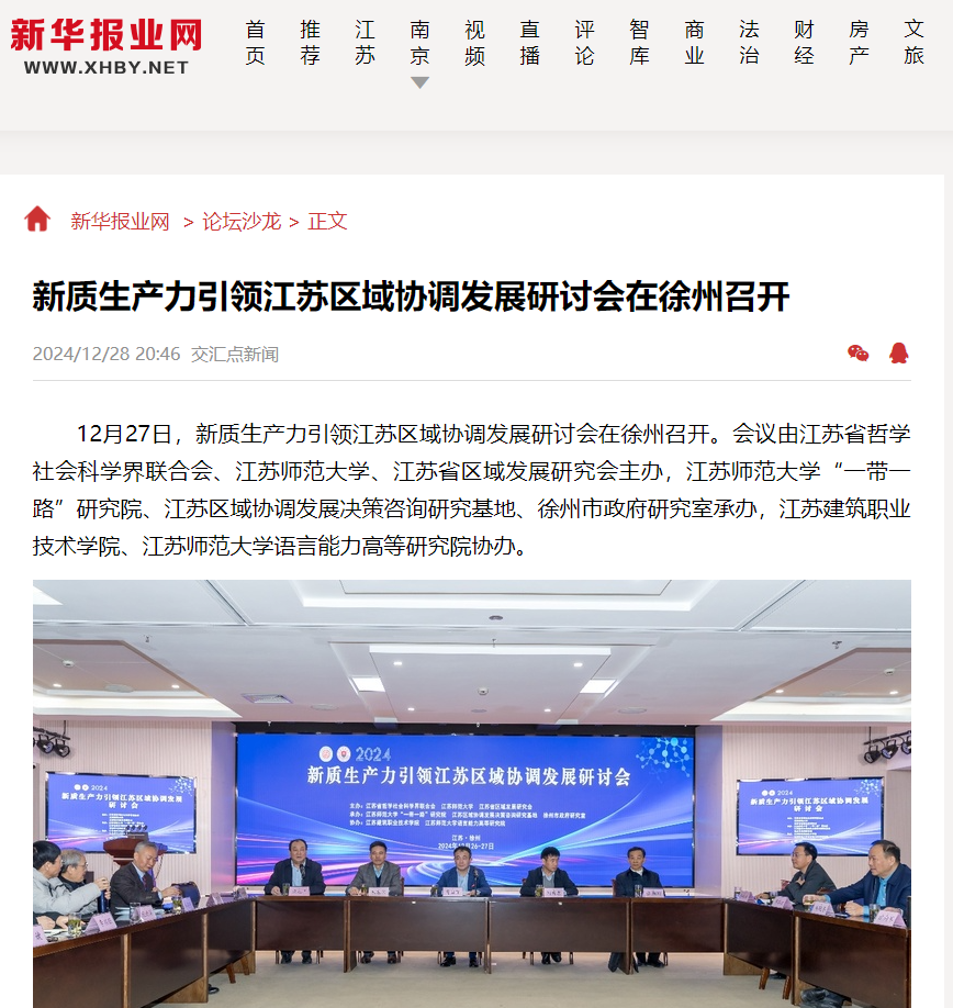 12月28日,新華報(bào)業(yè)網(wǎng)交匯點(diǎn)新聞報(bào)道在我校舉辦的新質(zhì)生產(chǎn)力引領(lǐng)江蘇區(qū)域協(xié)調(diào)發(fā)展研討會(huì),報(bào)道內(nèi)容如下: