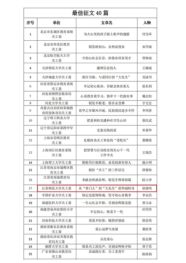 近日,教育部關工委公布了“楓葉正紅一一記教育系統(tǒng)關心下一代優(yōu)秀人物”征文活動的評審結果,經(jīng)省教育系統(tǒng)關工委遴選推薦,我校報送參評作品《從“掌門人”到“大先生”的華麗轉身——記江蘇師范大學關工委常務主任徐放鳴》榮獲“最佳征文”獎。