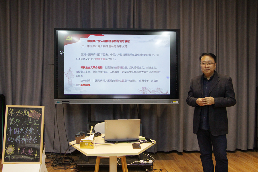 12月28日下午,第40期“餐廳·六點匯”活動在泉山校區“餐廳·六點匯”實踐基地舉行。公共管理與社會學院黨委書記吳迪就“中國共產黨人的精神譜系”這一主題與在場同學進行交流。